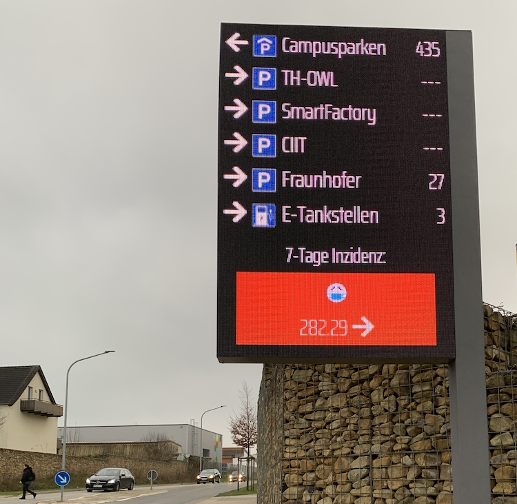 Dynamische Parkleitsysteme sind in vielen Städten bereits Stand der Technik. Warum also das Rad neu erfinden? Forscher des Lemgoer Fraunhofer-Instituts und des Instituts für Industrielle Informationstechnik der Technischen Hochschule OWL haben das Thema neu gedacht und die Funktionen eines Parkleitsystems mit denen eines Echtzeit-Informationssystems (Digital Signage) auf der Basis von IoT-Technologien kombiniert. Das so entstandene System vereinfacht nicht nur die Parkplatzsuche, indem es Autofahrer zu einem freien Parkplatz leitet und damit den Suchverkehr sowie die Fahrzeugemissionen reduziert. Es ist gleichzeitig eine sehr einfach skalierbare und multifunktional einsetzbare Lösung für den Einsatz in Kommunen entstanden, um Autofahrer, Radfahrer und Fußgänger im öffentlichen Raum zu informieren. "Ob als Stadt- oder Campus-Informationssystem, oder als Verkehrsleitsystem, ob für Anwendungen in kleinen oder großen Kommunen, die Einsatzmöglichkeiten sind riesig groß!", ist Professor Dr. Jürgen Jasperneite, Direktor des Fraunhofer IOSB-INA und Professor an der Technischen Hochschule Ostwestfalen-Lippe (TH-OWL) in Lemgo, von der entwickelten Lösung überzeugt. Das Herzstück ist die Urbane Datenplattform, über die beliebige Sensorwerte und Datenquellen verarbeitet und über verschiedene Kanäle, z.B. Displays oder Apps, an die Nutzer in Echtzeit übermittelt werden können. Eingesetzt und getestet wird die Lösung derzeit mit drei Outdoor-Displays an den verschiedenen Zufahrten zum Innovation Campus Lemgo und einer App. Die vorhandenen Parkplätze werden über mehrere IoT Edge Nodes in Echtzeit erfasst. Um die vielfätligen Einsatzmöglichkeiten zu demonstrieren, werden neben Hinweisen der Campusakteure zu Veranstaltungen aktuell auch die lokalen Inzidenzwerte des RKI automatisiert verarbeitet und visualisiert. Darüber hinaus wurde  eine Schnittstelle zu dem Warnsystem KATWARN realisiert. Künftig sollen weitere Sensoren und intelligente Algorithmen für noch mehr Funktionalität sorgen. Eine interessante Fragestellung ist beispielsweise die Gestaltung der Schnittstelle zu den Nutzern. "Insbesondere Autofahrer können den Inhalten nur wenige Sekunden Aufmerksamkeit schenken, so dass wechselnde Inhalte nur eingeschränkt sinnvoll sind. ",so Benedikt Lücke, wissenschaftlicher Mitarbeiter am Institut für Industrielle Informationstechnik der TH-OWL.