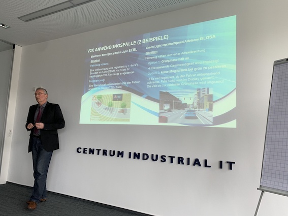 Dr. Joseph Urhahne von den Ford-Werken Köln hielt auf Einladung von Professor Jürgen Jasperneite vor ca. 60 Zuhörern im CIIT einen Vortrag zum aktuellen Stand des autonomen und vernetzten Fahrens. Als Ingenieur von Ford in der Forschung und Vorausentwicklung arbeitet Dr. Urhahne selbst am automatisierten Fahren in verschiedenen Projekten mit.