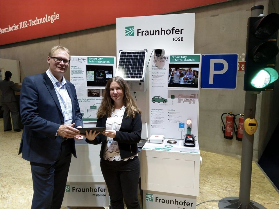 Das Fraunhofer IOSB-INA stellte auf dem Gemeinschaftsstand der Fraunhofer-Gesellchaft Lösungsangebote für die Digitalisierung der technischen Infrastrukturen von Kommunen und Tools zur Strategieentwicklung vor.